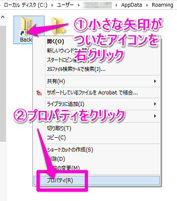 その場合は、シンボリックリンクを右クリックし、プロパティを選択。