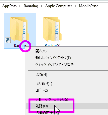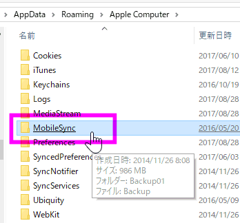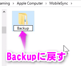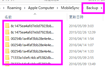 すでにバックアップをしたことがある場合、この「Backup」を開くと長い名前のフォルダが作成されていると思います。