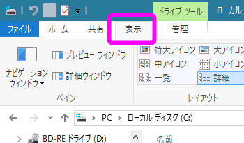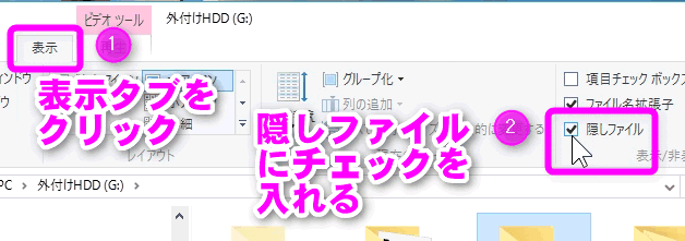 エクスプローラーの①「表示」をクリックし、②「隠しファイル」にチェックを入れておきます。