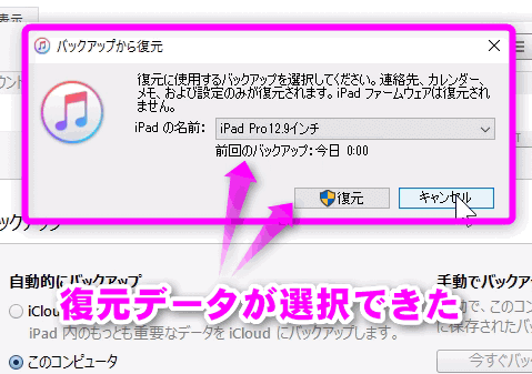 バックアップが終了し、復元できるか確認します。すると、いまバックアップした項目が復元リストに表示されていました。成功です!