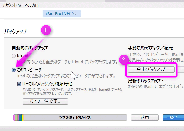 実際にバックアップが成功するか試してみました。iPhoneとパソコンをUSBケーブルで繋ぎ、iTunesを起動。「バックアップ」にある①「このコンピュータ」にチェックを入れ、②「今すぐバックアップ」をクリックします。