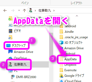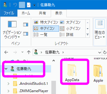フォルダがたくさんありますが、その中から「AppData」というフォルダを探して開きます。隠しフォルダのため、他のフォルダより薄い色になっています。
