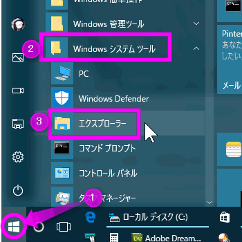 まずはエクスプローラーを起動します。①「スタートボタン」をクリックして、スタートメニューから②「エクスプローラー」をクリックします。