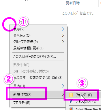 この作成した①フォルダを右クリックし、②「リンク元として選択」をクリックします。