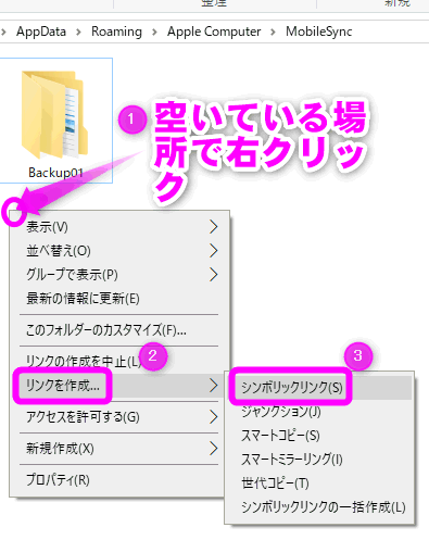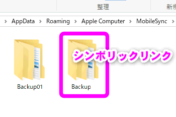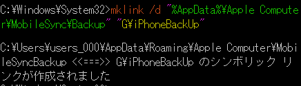 となっていますが、「mklink /d "C:\Users\ユーザ名\Apple\MobileSync\Backup" "」が正しい表記ではないでしょうか?