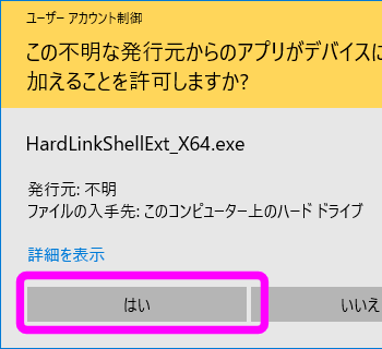 ダウンロードしたファイル「HardLinkShellExt_X64.exe」をダブルクリックして立ち上げます。