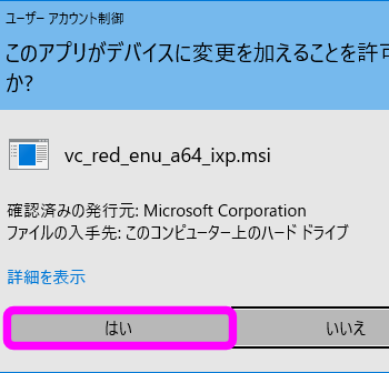 ユーザーアカウント制御の警告が表示されるので、「はい」をクリックします。