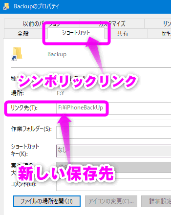 コマンドプロンプトにてシンボリックリンクの作成までは成功したのですが、ショートカットの作成ができず、バックアップを試みても新しい保存先へ保存されない状態です。。。