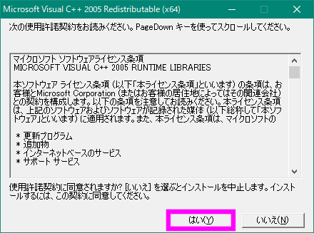 これで「Microsoft Visual C ++ 2005再頒布可能パッケージ」がインストールされました。
