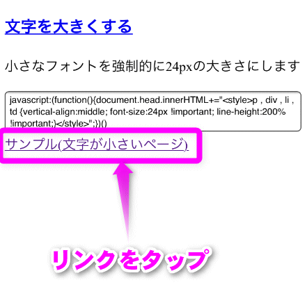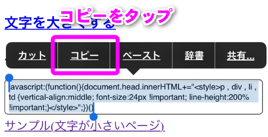 先ほどのページの「サンプル(文字が小さいページ)」の部分をタップします。