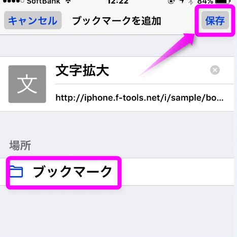 「場所」が「ブックマーク」になっていることを確認し、右上の「保存」をタップします。