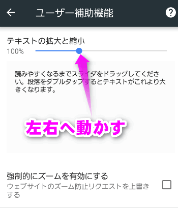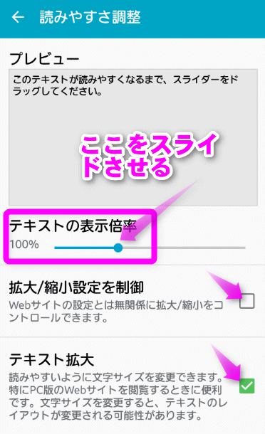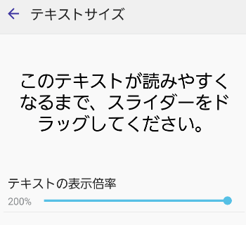 このスライダーを右に動かせば、フォントが大きくなります。(最大200%)