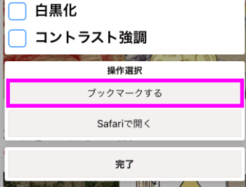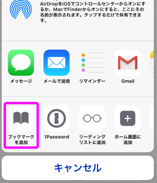 画面の下から色々なボタンが表示されるので、「ブックマークを追加」をタップします。