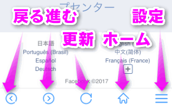 Safariとほぼ変わりないのですが、画面下部に表示されるボタンの役割はこんな感じ。