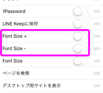 すると一覧の中に「Font Size +」や「Font Size -」などの項目があるので、ここをオン(黄緑色)にします。