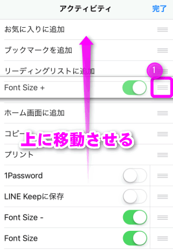 オンにしたら①の部分をタップしたまま上にずらしていきます。