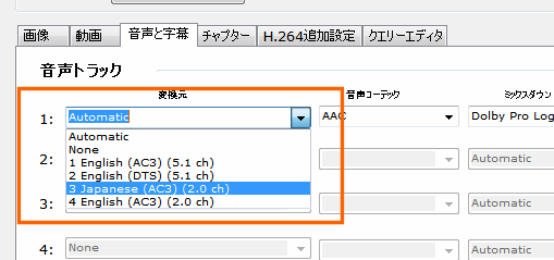 複数の音声がある場合、「音声・字幕」タブの「音声トラック」で選択することができます。