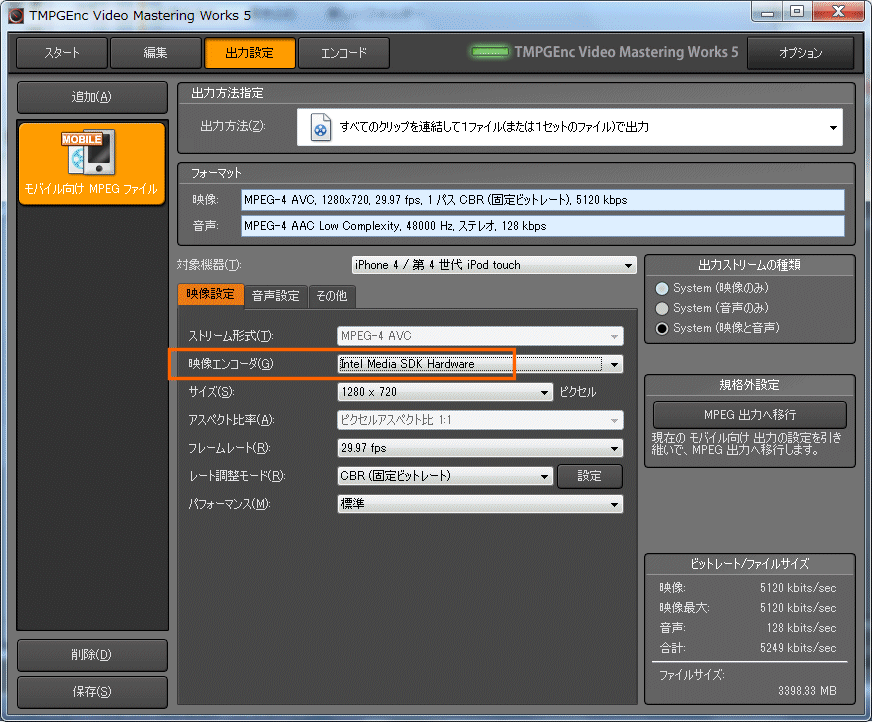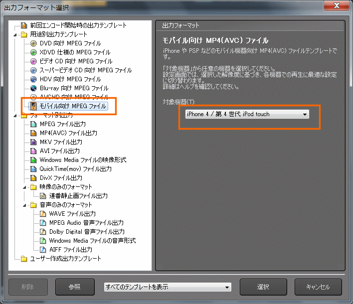 TMPGEncでもiPhone専用に変換するモードが用意されているので、初心者でも簡単。