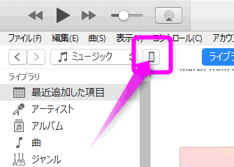iTunesを立ち上げたら、iTunesの左上にiPhoneのアイコンが表示されるので、ここをクリックします。