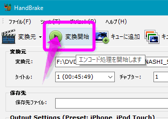 handBreakeの右側にある「プリセット」の「iPhone & iPod Touch」を選択してください。