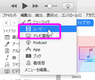 iTunesに登録した動画を整理・編集する場合は、iTunesの右上の「ミュージック」の部分をクリックし・・・