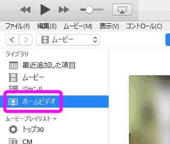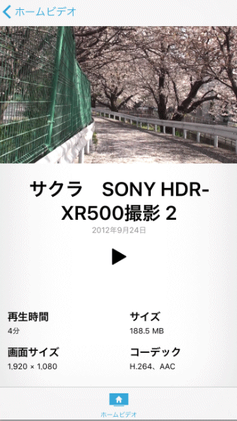 ビデオアプリを立ち上げると「ホームビデオ」の再生リストが表示されて、転送した動画が登録されています。