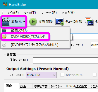 左上の「変換元」というボタンをクリックし、パソコン内に保存したDVDフォルダを指定します。