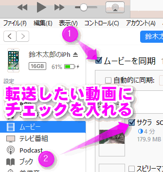 ①「ムービーを同期」にチェックを入れ、②iTunesに登録された転送したい動画にチェックを入れます。