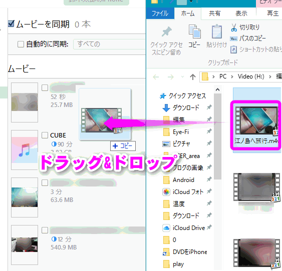 変換した動画ファイルをiTunesにドラッグ・アンド・ドロップします。