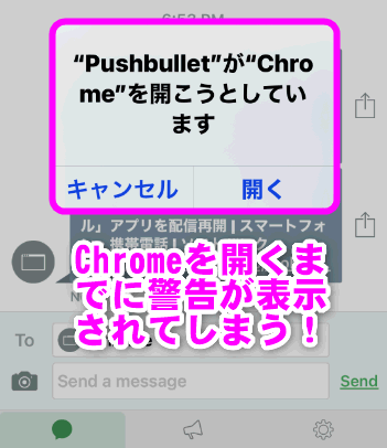 例えばPushbulletというアプリで送られてきたURLを開こうとすると、このように「〇〇が"Chrome"を開こうとしています」と表示され、「キャンセル」か「開く」か選択しなければなりません。