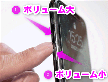 すぐに離し、今度はボリュームの下のボタンを押し、同じようにすぐに離します。
