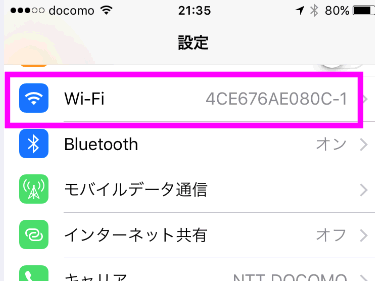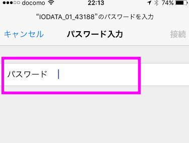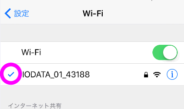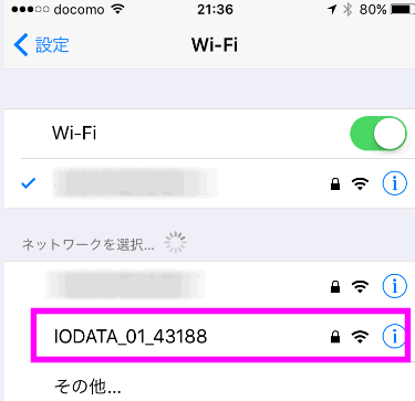 設定のWi-Fiを開き、同じように「IODATA_」で始まるアクセスポイントをタップすれば、パスワードを入力しなくても接続できます。