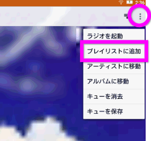右上のメニューボタンをタップすると、「プレイリストに追加」とあるので、これをタップすればCDレコで取り込んだ曲もプレイリストの作成ができます。