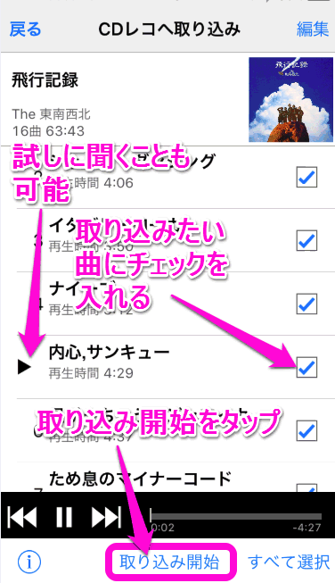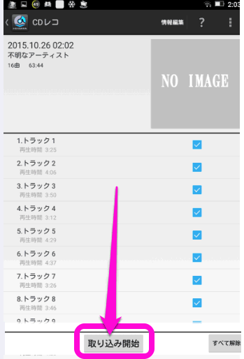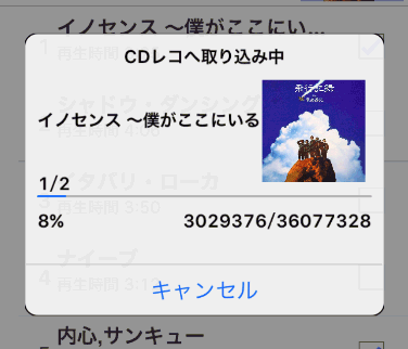 すべての曲にチェックが入っているので、この状態で画面下の「取り込み開始」をタップすると、曲の取り込みが開始されます。