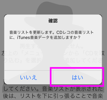 なお、iPhoneの場合、パソコンから転送した曲やiTunes Storeで購入した曲もCDレコで再生できるようにするか聞いてくるので、「はい」をタップしておいてください。