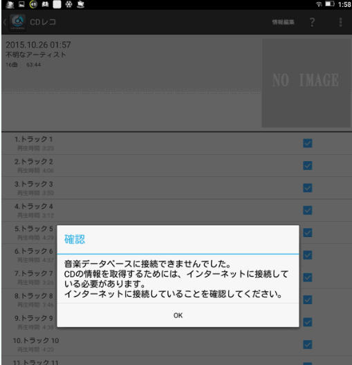 Wi-Fi以外にモバイル通信が出来るスマホの場合は、CD情報を元にネットからジャケット、アーチスト名、アルバム名、曲名などを取得してくれるのですが、iPadやSIMのはいっていないタブレットの場合、Wi-FiがCDプレーヤーとの接続に使われてしまい、インターネットに接続できません。