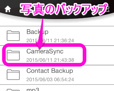 カメラロールのバックアップは、「CameraSync」の中に保存されています。