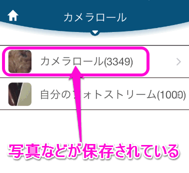 iPhoneの「写真」内にあるアルバムの一覧が表示されるので、「カメラロール」をタップします。