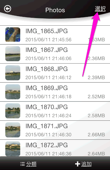 もし、選択した写真のみバックアップしたい場合は、右上の「選択」をタップします。