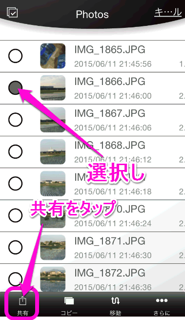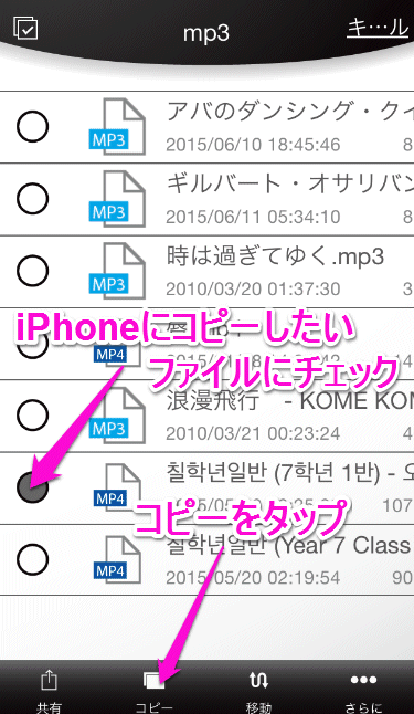 iPhone内に保存するには、画像と同じように保存したいファイルにチェックを入れ、「コピー」をタップ。