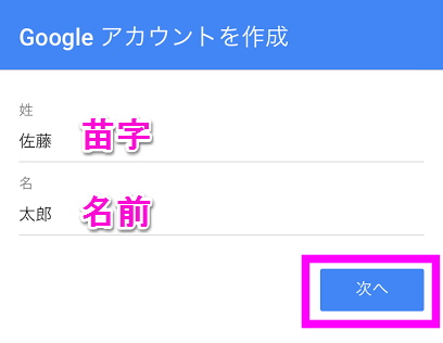 Gmailのメールアドレスの「@」より前の部分を決めます。好きな英数字を入力します。
