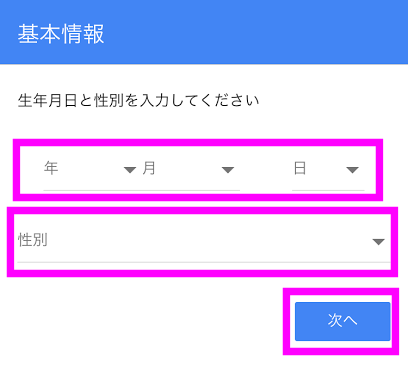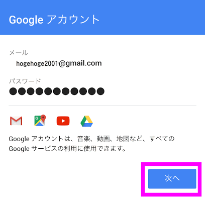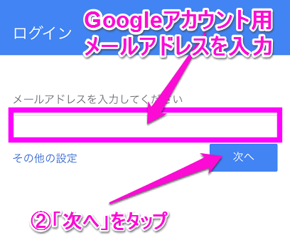 Googleアカウントを既に持っている人は、Gmailのメールアドレスを入力して、「次へ」をタップします。