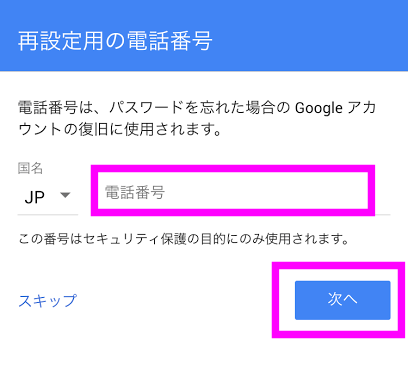 パスワードをわすれた場合に必要になる電話番号を入力します。電話番号の登録はスキップすることも出来ますが、パスワードを忘れたり、乗っとり被害に合わないためにも、入力しておいたほうがいいと思います。