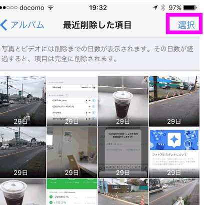 削除ボタンをタップしてから30日間はここに保存されます。もし、完全にiPhoneから削除したり、もしくは逆に復元したいときは、右上の「選択」をタップし