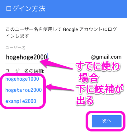 メールアドレスは世界でたった1つのものでなくてはなりません。なので、すでに誰かに使われている場合は、別のものにするか、下に表示された候補の中から選択してください。