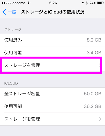 続いて、「ストレージとiCloudの使用状況」をタップします。