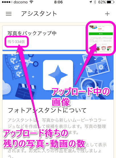 「残り334個」は、あと334個の写真や動画がアップロード待ち。という意味です。