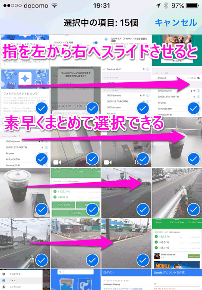 削除したい写真を選択します。まとめて選択するには、左から右へ指をディスプレイから離さずにスライドさせると一気に選択できます。