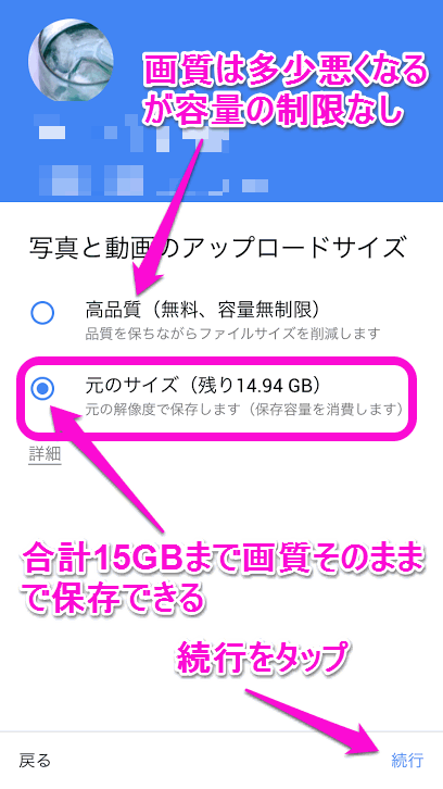 もし、画質を落としたくない場合は、「元のサイズ」をチェックしてください。15GB以下という制限がありますが、高画質のままバックアップできます。