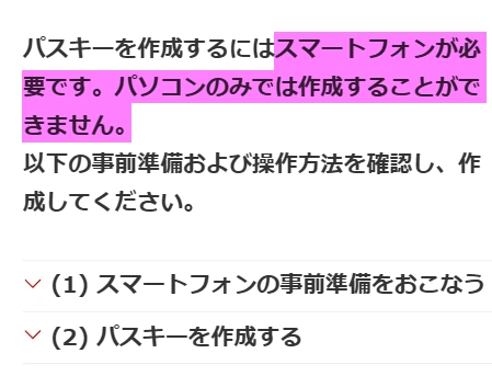 「パスキーを作成するにはスマートフォンが必要です。パソコンのみでは作成することができません。」